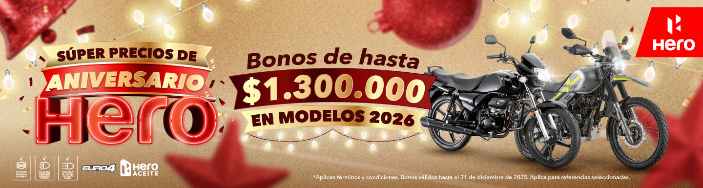 ANIVERSARIO HERO: Vigente del 17 de octubre de 2025 al 31 de diciembre de 2025 hasta las 12:00 del mediodía o hasta agotar existencias, lo que ocurra primero (30.006 premios disponibles: 30.000 llaveros y 6 motocicletas marca HERO modelo 2026 distribuidas así: 1 Eco Deluxe, 2 Hunk 125, 1 Hunk 4V, 1 Xoom 110 y 1 Xpulse 200 4V). Los gastos de matrícula, SOAT y ganancia ocasional no están incluidos y deberán ser asumidos por el ganador.